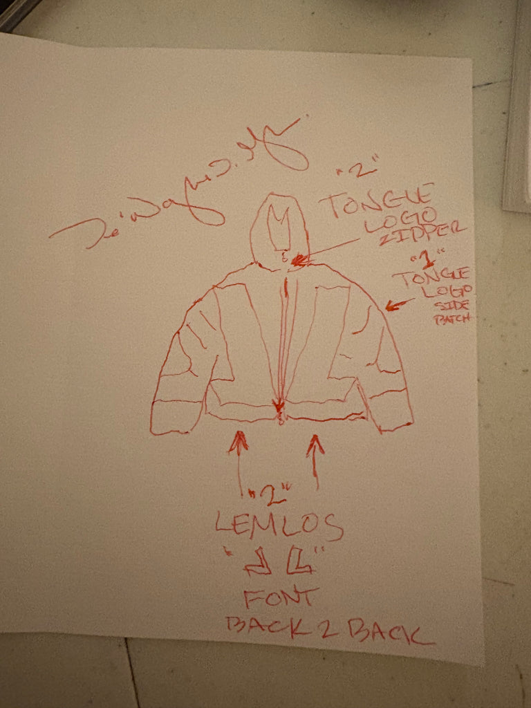 - LEMLOS is embroidered across the bottom back hem of the puffer in the same style and font (as per mock)