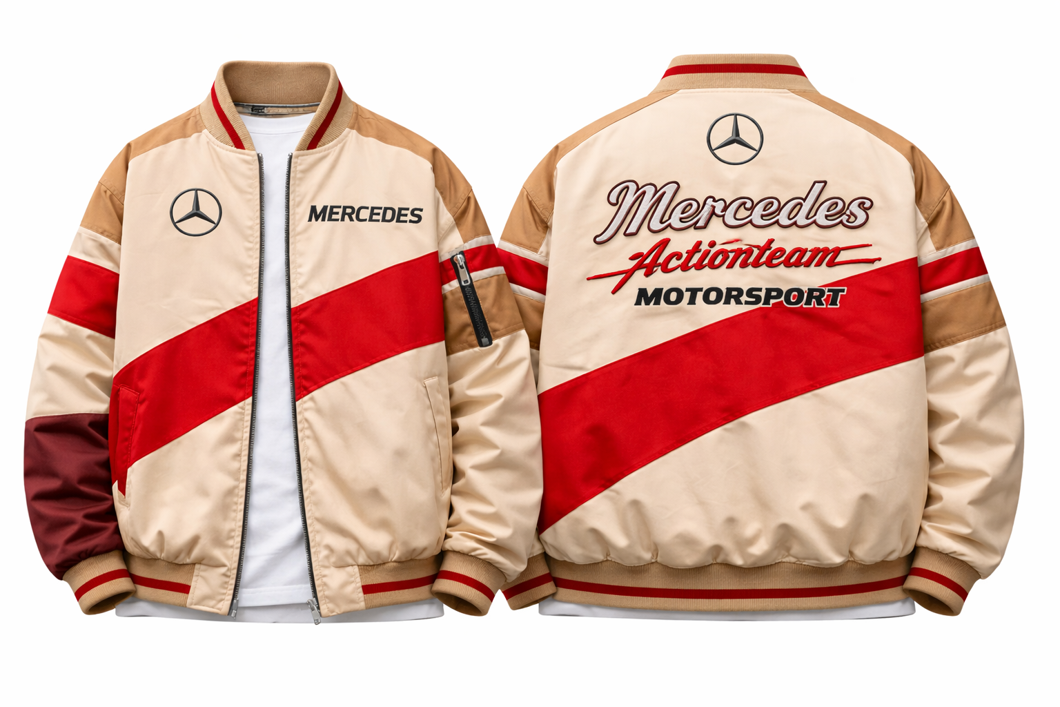 • Jacket Hem: Elasticated rib knit striped hem in red & beige color (as per reference)