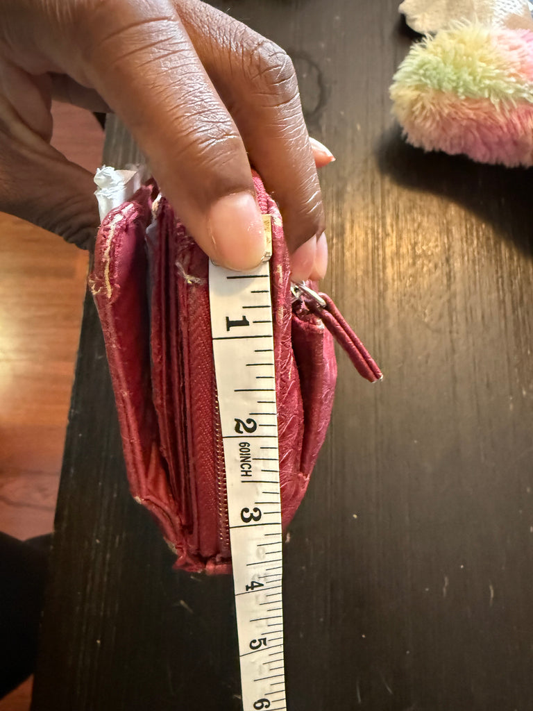 • Zipper pocket on the back with a small pull tab and a center divider, creating two equal sections for bills and receipts. (as per mock & references)