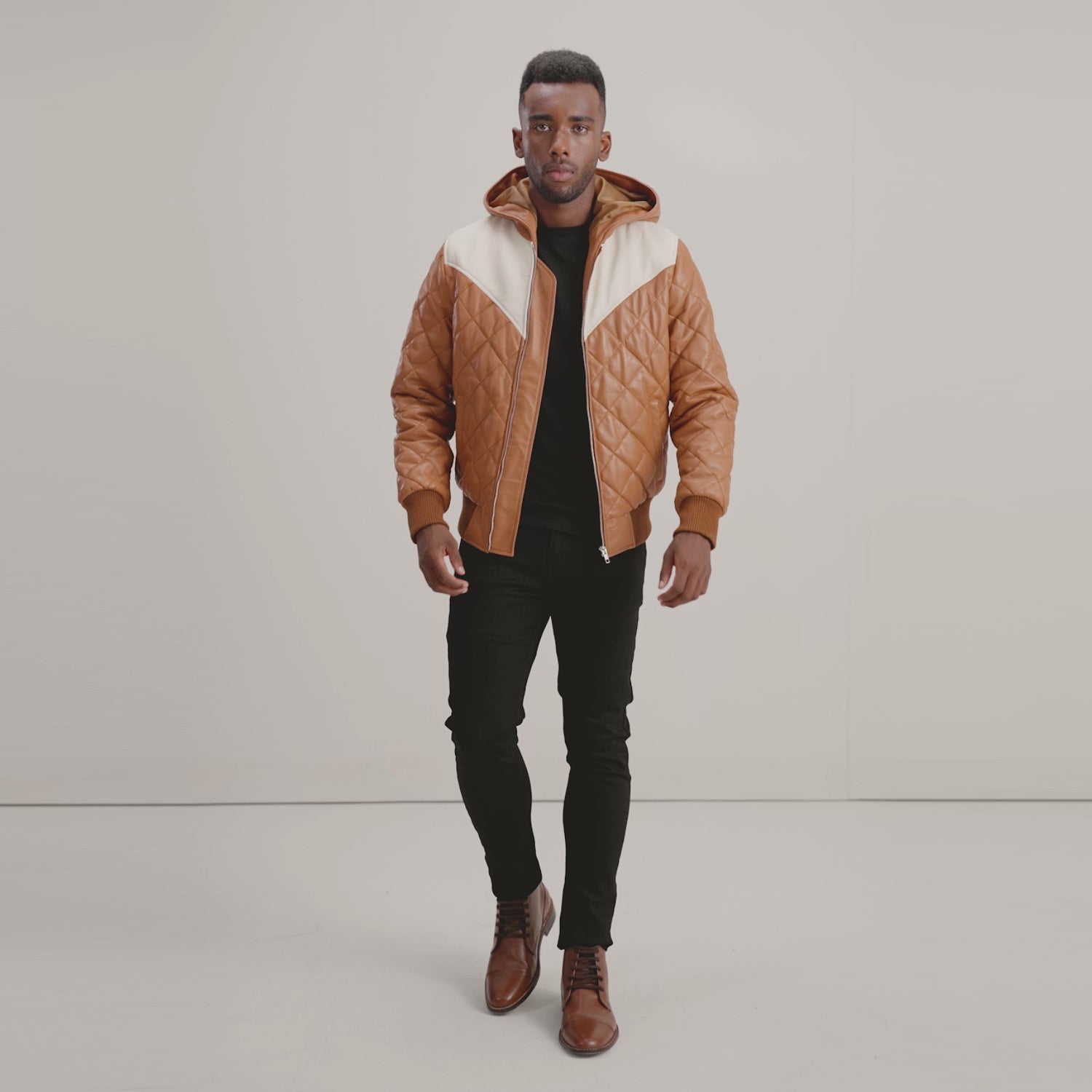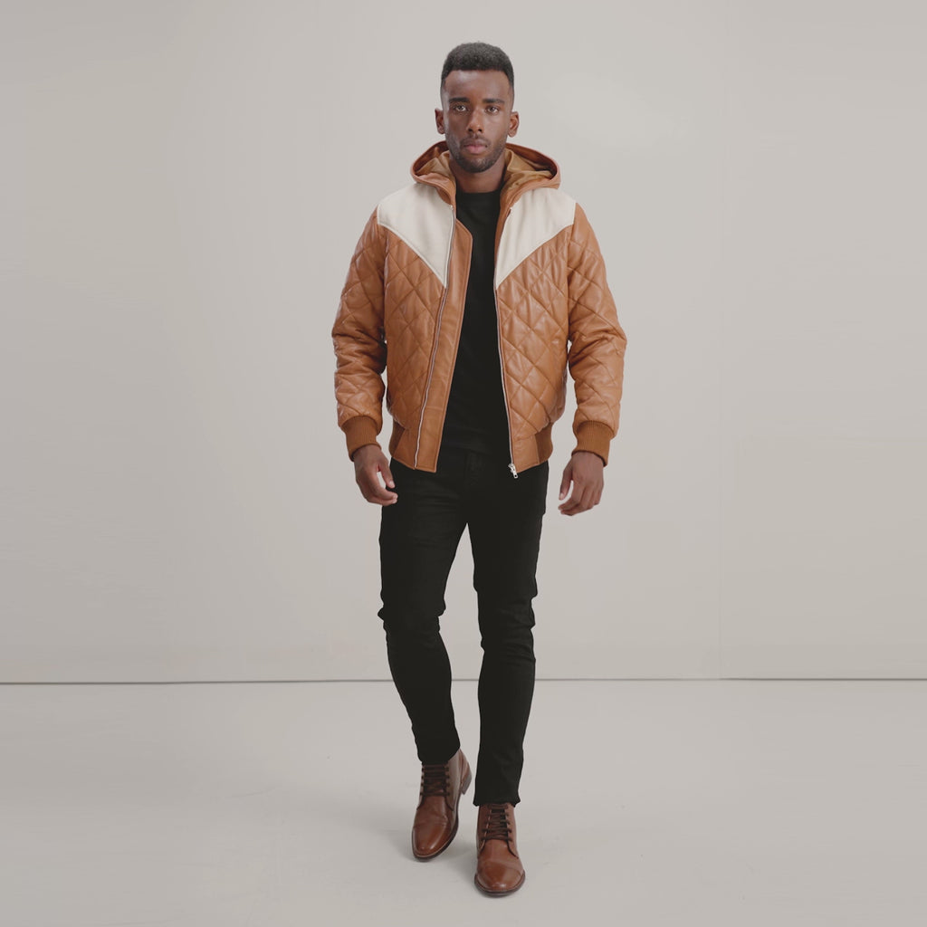 Norman Tan Hooded Bomber Leather Puffer Jacket